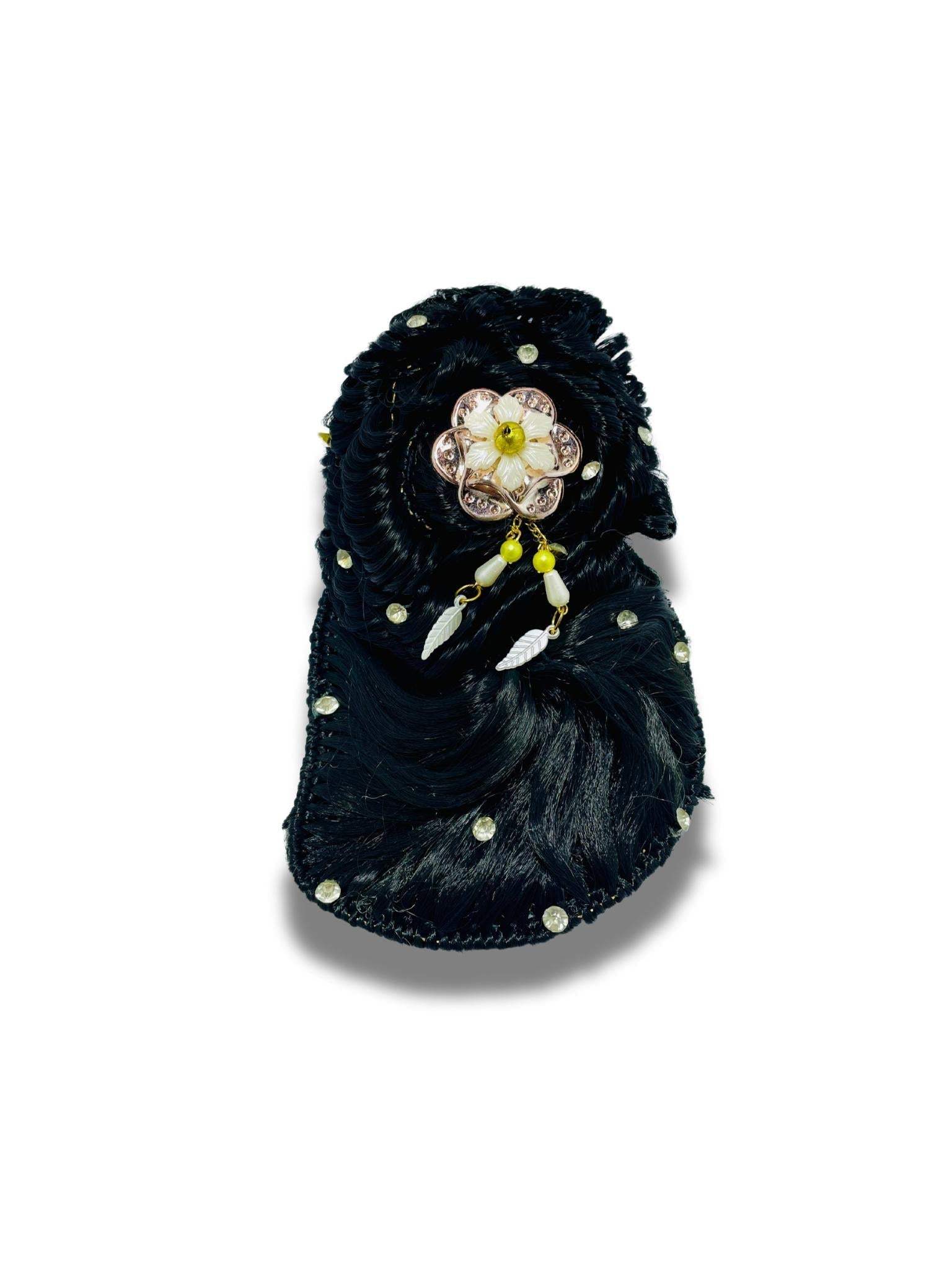 This stunning fancy hair bunch is intricately designed with delicate embellishments to add a touch of glamour to your look. Featuring a sophisticated floral brooch at the center, adorned with beads and rhinestones, it provides an elegant and timeless appeal. The accessory is crafted from glossy synthetic hair styled in a perfect swirl pattern, making it an ideal choice for formal events, weddings, or festive occasions. Accented with shimmering studs, it’s both functional and fashionable, holding your hair in place while enhancing your style. Elevate your hairstyle with this chic piece from Elara Hair!