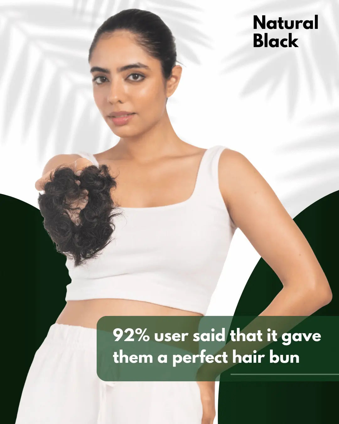 Just tie your hair into a bun or ponytail, then wrap the messy bun scrunchie around it like a hair tie. Adjust the bun with your fingers to get your desired volume and style β it's that easy!
